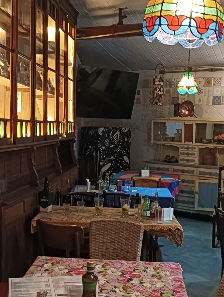 Tranquilo, rústico e afetivo com mesas grandes. Decoração brasileira artesanal, iluminação quente e mesas amplas.